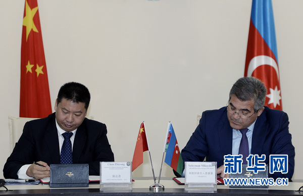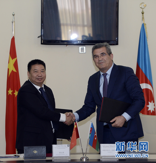 6月27日,深圳市区域经济协作促进会会长陈志勇(左)与阿塞拜疆总统办公厅卡拉达赫区区长米卡伊洛夫·苏来曼签署建设"阿塞拜疆·中国自由贸易产业园区"合作意向书。新华网发(巴巴耶夫摄)