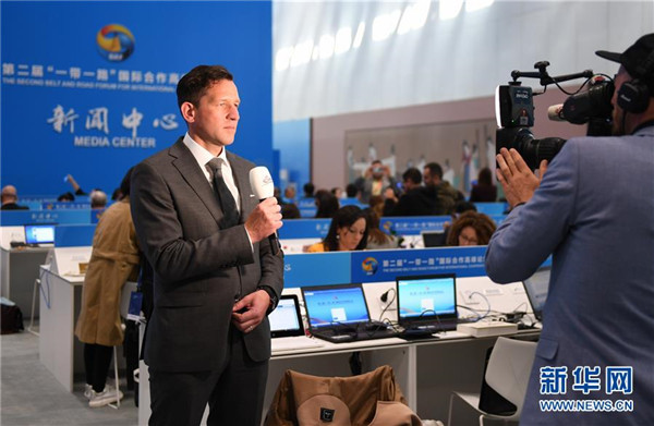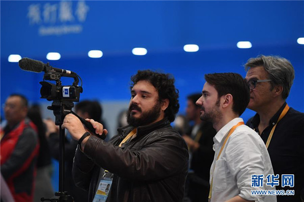 4月26日,第二届“一带一路”国际合作高峰论坛开幕式在北京国家会议中心举行。这是媒体记者在新闻中心关注开幕式现场。 新华社记者 鞠焕宗 摄