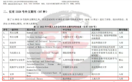 日前,由中国社会科学评价研究院主办的第十届全国人文社会科学评价高峰论坛暨期刊评价报告发布会在北京举行。中国社会科学评价研究院在论坛上正式发布《中国人文社会科学期刊AMI综合评价报告(2022)》,由世界科学出版社与上海大学合办英文期刊《Critical Theory(批评理论)》获评顺利入库,正式入选中国人文社会科学期刊AMI综合评价体系。