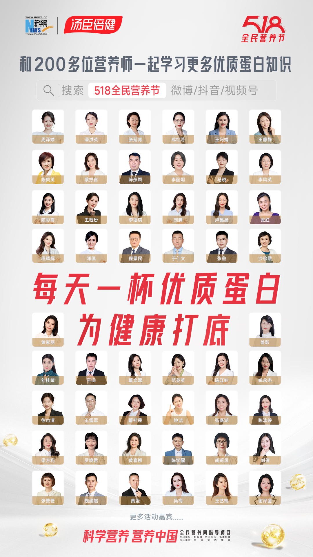 5月18日,由新华网主办、汤臣倍健协办、中国营养学会指导的518全民营养节,邀请多位营养界大咖与200多位营养师,共同聚焦“优质蛋白”的关键议题,帮助大众解决当下营养难题,并倡议“每天一杯优质蛋白,为健康打底”。