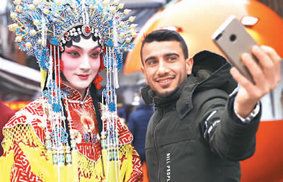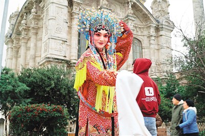 图为随行的京剧花旦头戴凤冠,身着彩绣女蟒袍在土耳其街头演唱京剧《大登殿》经典选段,精彩的表演引来不少游客和当地居民驻足观看并合影。