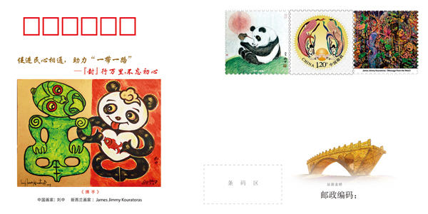 这次的中国·新西兰纪念封封底艺术作品《携手》由中国艺术家刘中和新西兰毛利族画家詹姆斯共同创作,是两国人民“心相通”的最佳见证。“心相通”就是文化的相通,文化的交流、文明的互鉴。文化融合是一股不可忽视的力量。在交流中互学互鉴,能够打破地域的界限,消除不同文化间的隔阂。“‘封’行万里 不忘初心”始终致力于推动中华文化走出去,深化人文交流与艺术交流,提升中华文化传播能力、推动文化传承创新,为“一带一路”经济带建设和文化发展贡献力量。