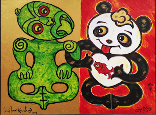 中国艺术家刘中和新西兰毛利族画家詹姆斯都擅长绘画动物,刘中用黑白红三色绘画了一只手捧金鱼的中国国宝熊猫。熊猫憨态可掬、栩栩如生。它手捧的红色金鱼在中国代表“年年有余”。对于起源于海洋的毛利族人来说,金鱼也是美好生活和风调雨顺的象征。詹姆斯主要用绿色绘制了毛利族的吉祥物TiKi。TiKi代表着传统的毛利族人形象,可以说是毛利族人的图腾。两位画家将熊猫和TiKi画成手挽手、肩并肩的姿态,并且整体来看两个吉祥物刚好形成了两个8的形状。8在中国代表“发”,寓意携手并进、共同发展、共同繁荣。