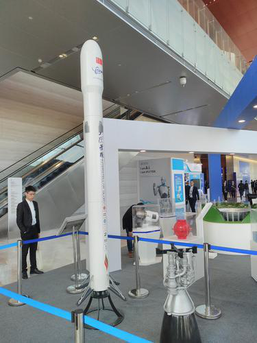 同样令观众驻足的展品,是国内知名的民营火箭:朱雀二号系列。这种液氧甲烷火箭,最大一款长50多米,推力可达1340吨。另一边还展出了可回收的“双曲线三号火箭”,一级底部有四个折叠的落地架。这款类似于SpaceX的国产火箭将在2022年首飞。