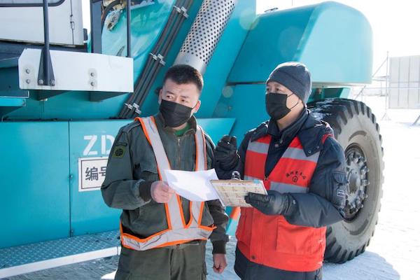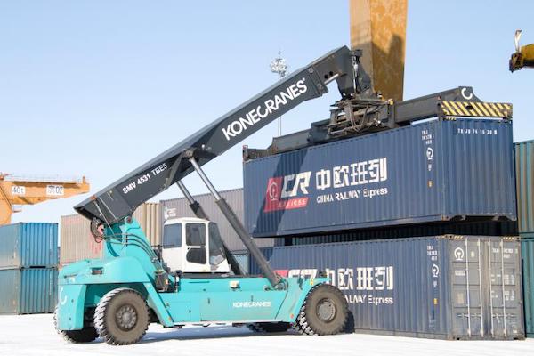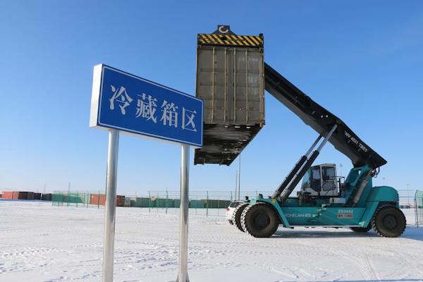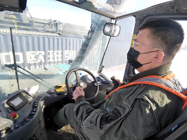 3月4日8时,我国最大陆路口岸站满洲里站集装箱作业场上,王宇佳驾驶着正面吊车在站场上一趟趟往返奔忙,一组组蓝色的集装箱在他的操作下整齐地排列在箱场上。