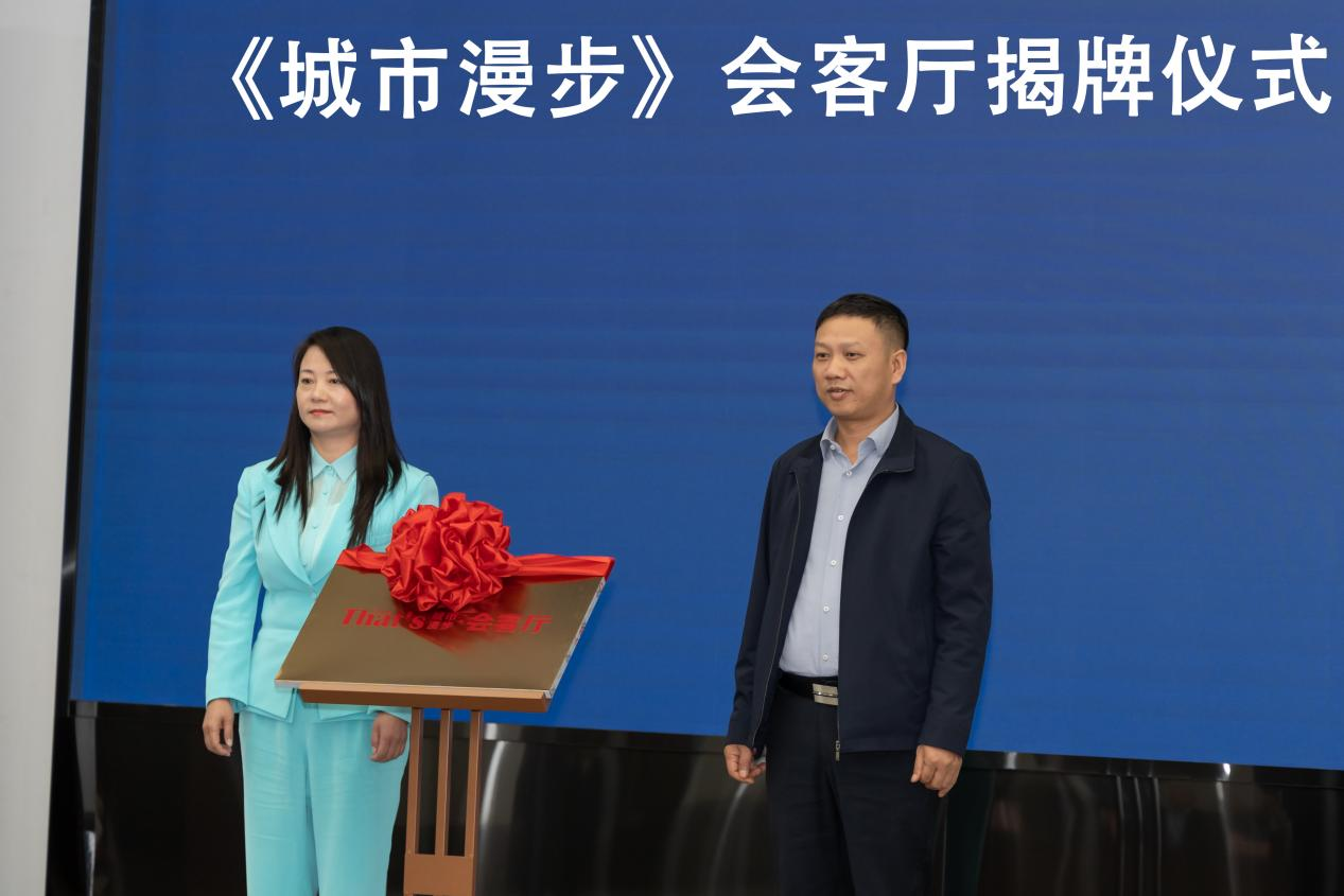 图为北京新影响文化发展有限公司国际文化交流中心负责人李永强与城市漫步中新文化发展(北京)有限公司代表郑颖共同为《城市漫步》会客厅举行揭牌仪式。