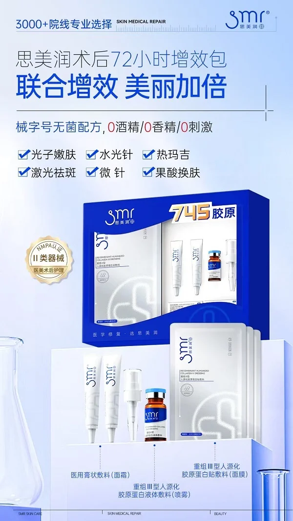 为此,肽源生物旗下品牌——思美润,在今年全新推出针对术后创面修复的72小时增效包,其中包含胶原敷料、胶原喷雾、医用面霜,能有效促进医美术后创面快速愈合恢复,预防术后炎症感染和色沉返黑。同时,医美术后肌肤细胞高度活跃,需要大量营养维持,72小时增效包能有效补充术后皮肤急需的营养,进而增强医美项目最终效果。