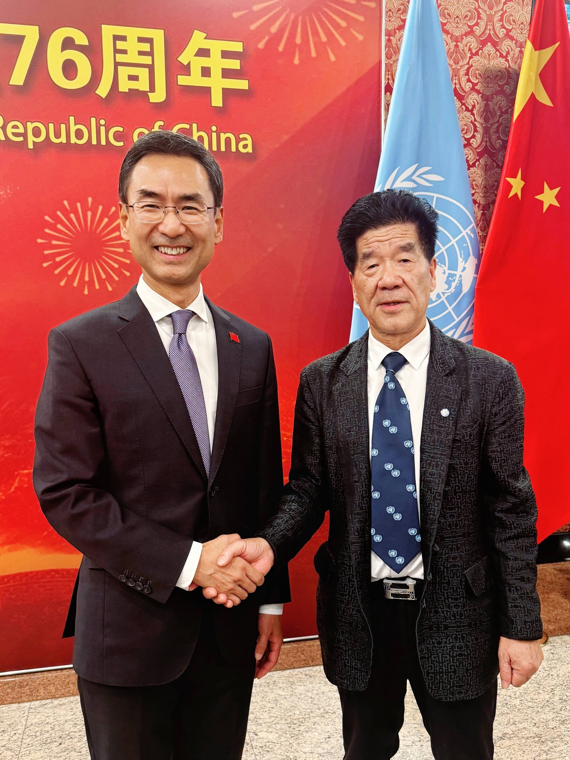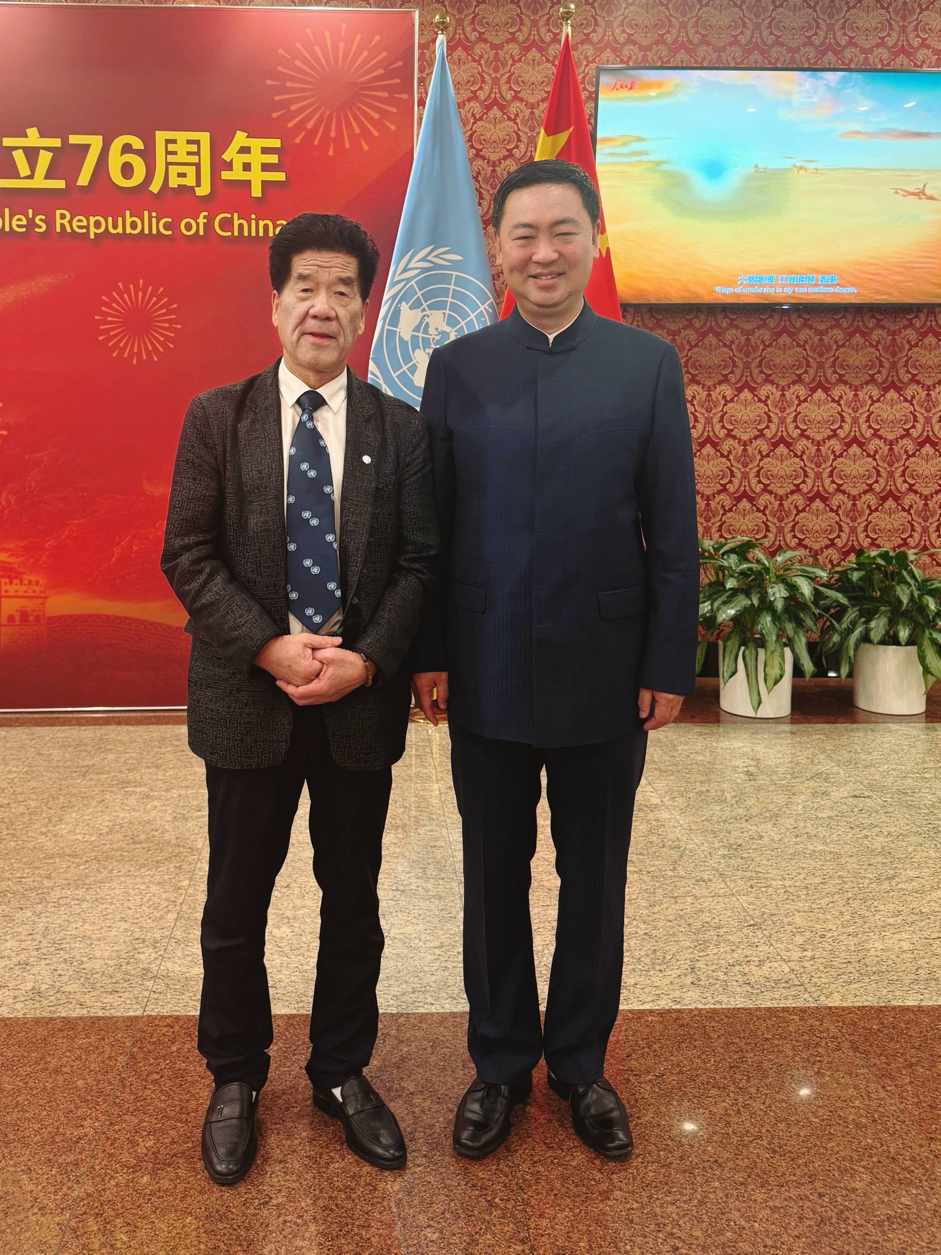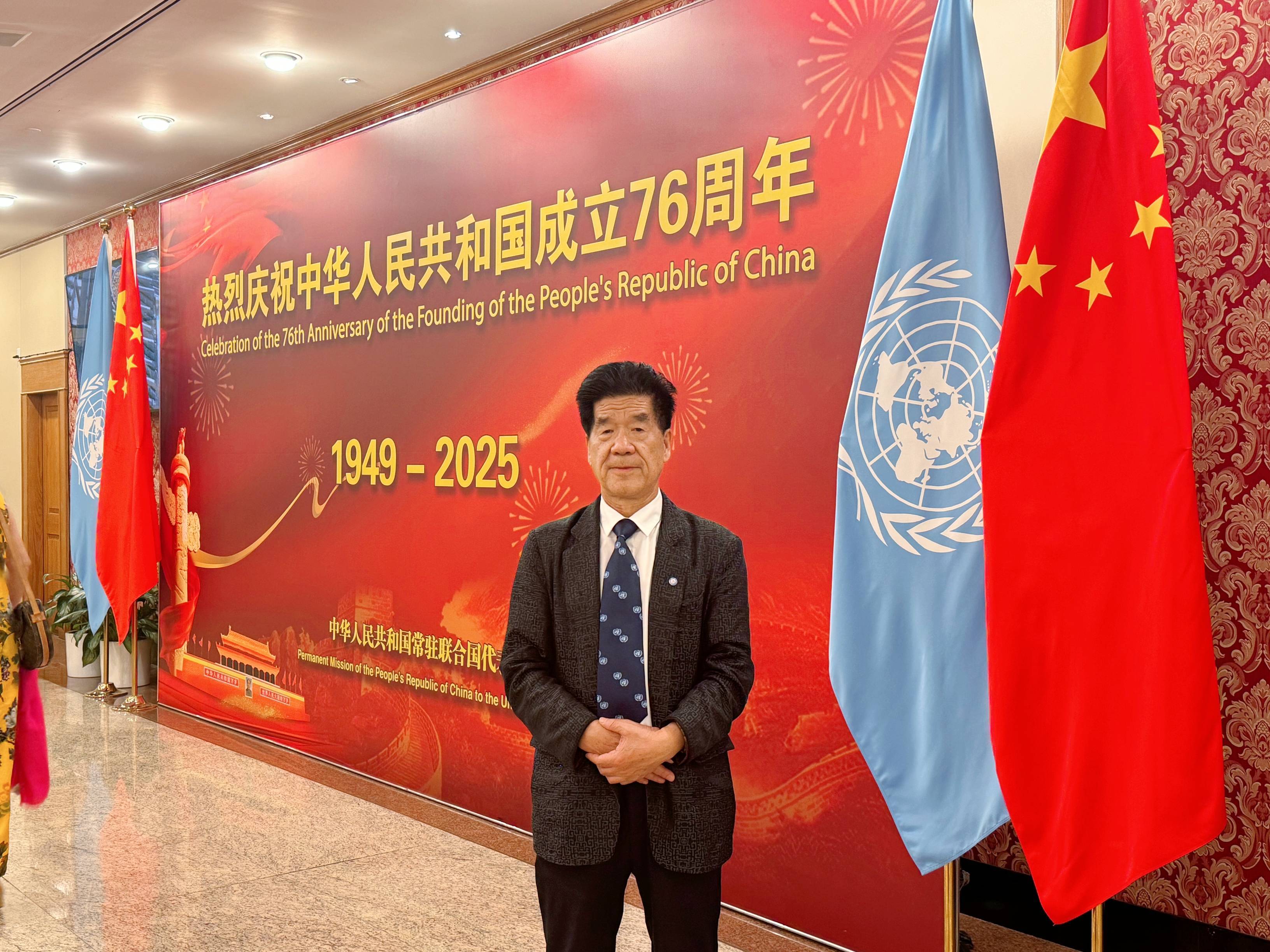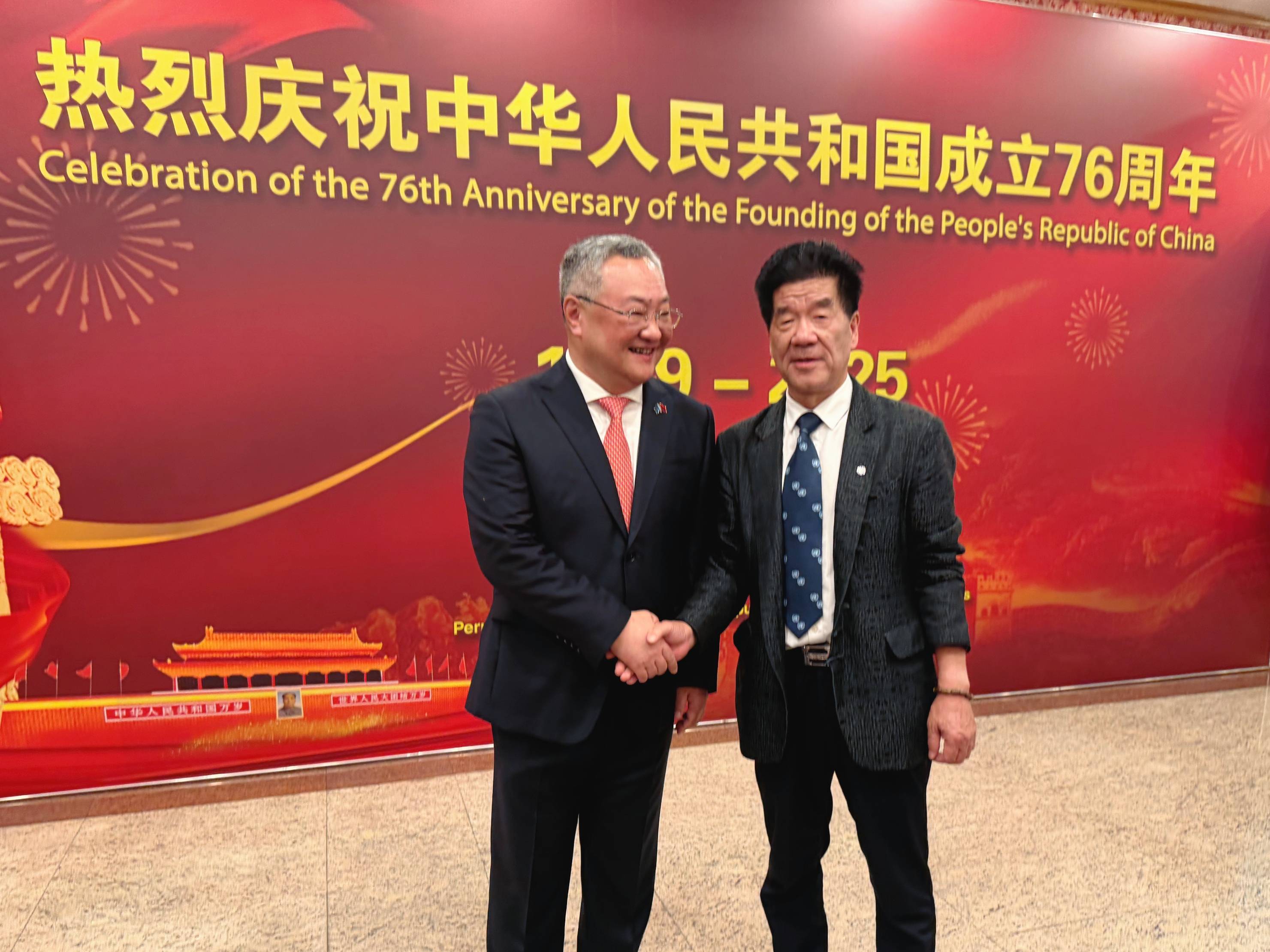 爱国侨领、中华福文化推广大使李贵明应邀出席本次庆典。他多次获邀参加联合国相关活动,长期在海外积极推广中华“福文化”。招待会期间,李贵明与中国常驻联合国代表傅聪大使、副代表耿爽大使、副代表孙磊大使,联合国副秘书长徐浩良、联合国副秘书长李军华,以及中国驻纽约总领馆总领事陈立等多位嘉宾进行了友好交流。