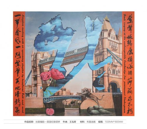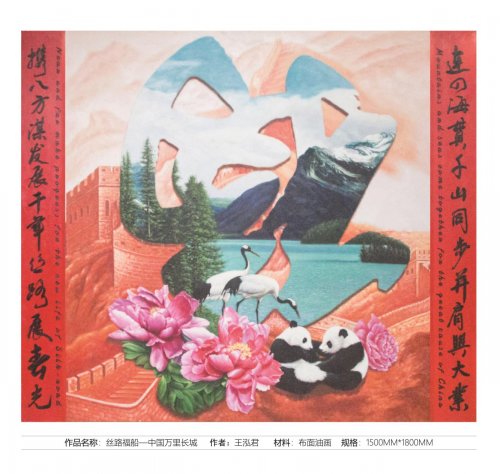 丝路福船系列油画作品是以各国著名的建筑,山水风景和动物为主要元素,融合了中国的诗词对联以及书法,用油画艺术形式表达丝路福船构建命运共同体的主旨思想。作品汇聚了中西文化,用中国传统送“福”的方式传达“福到”的寓意!象征“一带一路”建设和国际贸易为各国人民送来福气和福音,传达了中国人民对外合作共赢的诚意!王泓君院长说。