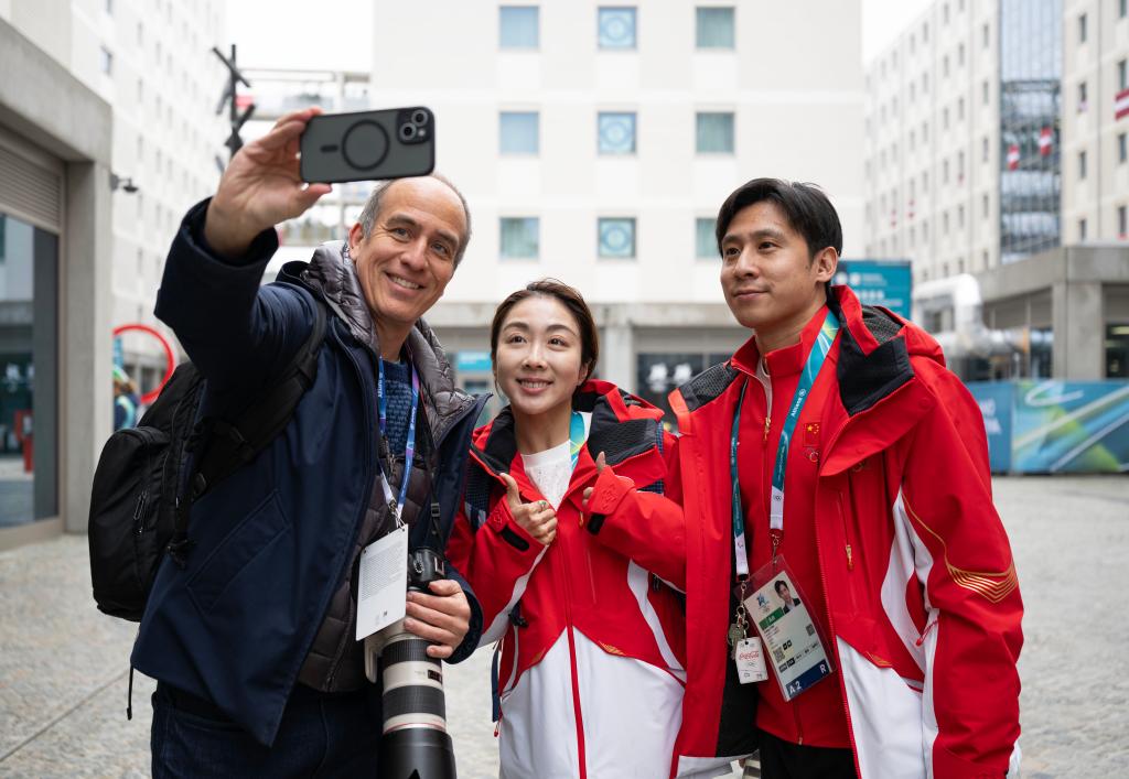 2月3日,一名记者与中国花滑队运动员隋文静(中)、韩聪(右)自拍留念。新华社记者 张豪夫 摄