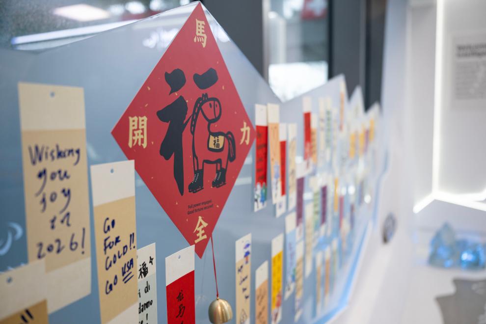 共享空间里也有中国元素。那里贴着一张写有“马力全开”并融入马元素的“福”字,其下方还悬挂着一个铃铛。不少外国运动员路过时,也会摸摸“红马”,拨动铃铛。