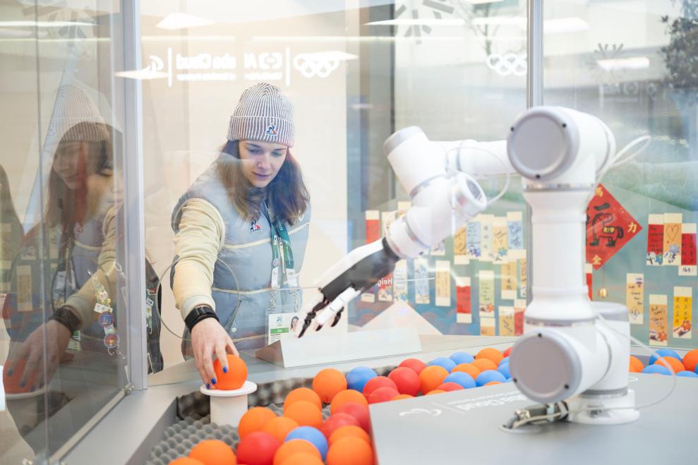 在共享空间内的阿里云智能徽章交换站,法国冰球运动员安娜·西蒙将一枚法国队的徽章放入球池后,按下展台上的屏幕,用法语说道:“帮我抓一个蓝色的球。”